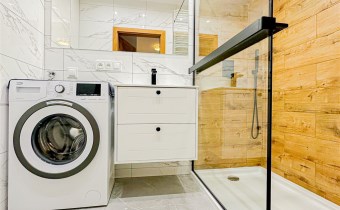 - Zmywarka, kuchnia indukcyjna, piekarnik elektryczny, pralka. łóżko małżeńskie, duża szafa, sofa, stół