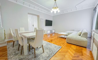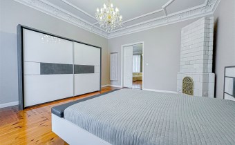 Mieszkanie zachowuje przedwojenny charakter – wysokie sufity, oryginalne piece kaflowe (pełnią funkcję dekoracyjną) oraz duże, jasne pomieszczenia.